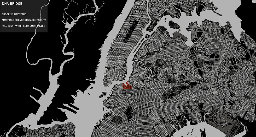 This is where robotics, genetics, and materials meet and a new future begins. The building is situated such that it is visible from Roosevelt to Ellis and Staten Islands. The bridge becomes part of the layered canvass looking down through the Queensboro, Williamsburg, Manhattan, and Brooklyn Bridges. The contorted strangeness of the structures provokes curiosity from the public, inviting them to learn more about science, connectivity, and ultimately themselves as human beings within the physical universe, in the place where these discoveries are being made. It is a macro vision of our micro future.